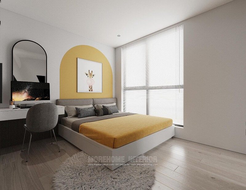 Giường ngủ phòng 2 người bọc nỉ nhung đầu giường sang trong, từng đường nét chạm khắc tỉ mỉ kết hợp màu trắng thanh thoát tạo nên một không gian nghỉ ngơi đẳng cấp, thoải mái nhất