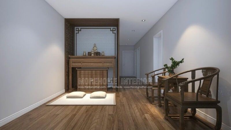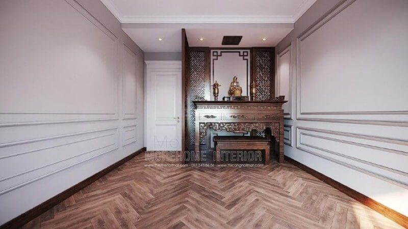 Thiết kế phòng thờ nhà chung cư phong cách hiện đại với nội thất gỗ tự nhiên cao cấp, gia chủ khéo léo kết hợp thêm vách ngăn tạo nên sự tôn nghiêm ở chốn linh thiêng
