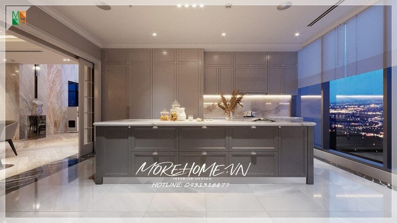 Phòng bếp được thiết kế tinh tế với nội thất bếp làm bằng gỗ tự nhiên theo phong cách cổ điển.
