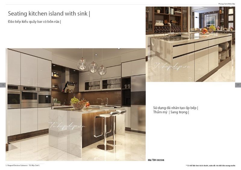 Tủ bếp gỗ acrylic màu trắng hiện đại với mặt bếp ốp đá nhân tạo cao cấp sẽ giúp không gian phòng bếp trở nên sáng sủa và sạch sẽ hơn.