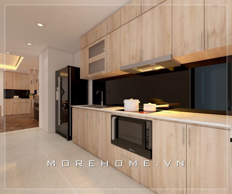 Mẫu tủ bếp đẹp, hiện đại với tone màu vàng kem được kiến trúc sư của MoreHome thiết kế nhằm mang đến không gian bếp tiện nghi và sang trọng.