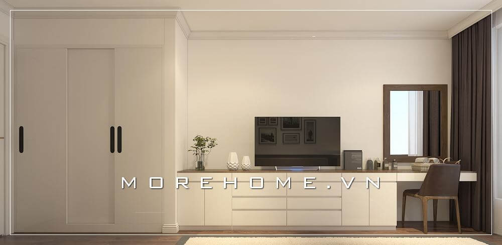 Tủ quần áo gỗ công nghiệp màu trắng ấn tượng, phần kệ ti vi được bố trí chính giữa tạo điểm nhấn ấn tượng cho cả căn phòng