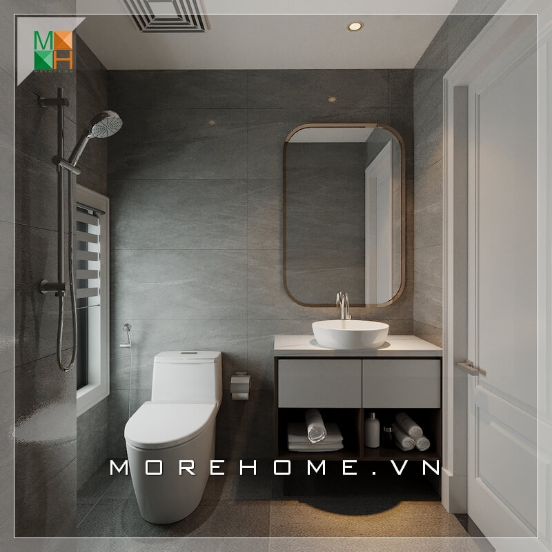 Bố trí dưới lavabo là tủ đựng tiện lợi hiện đại đựng được nhiều đồ lại gọn gàng, ngăn nắp.